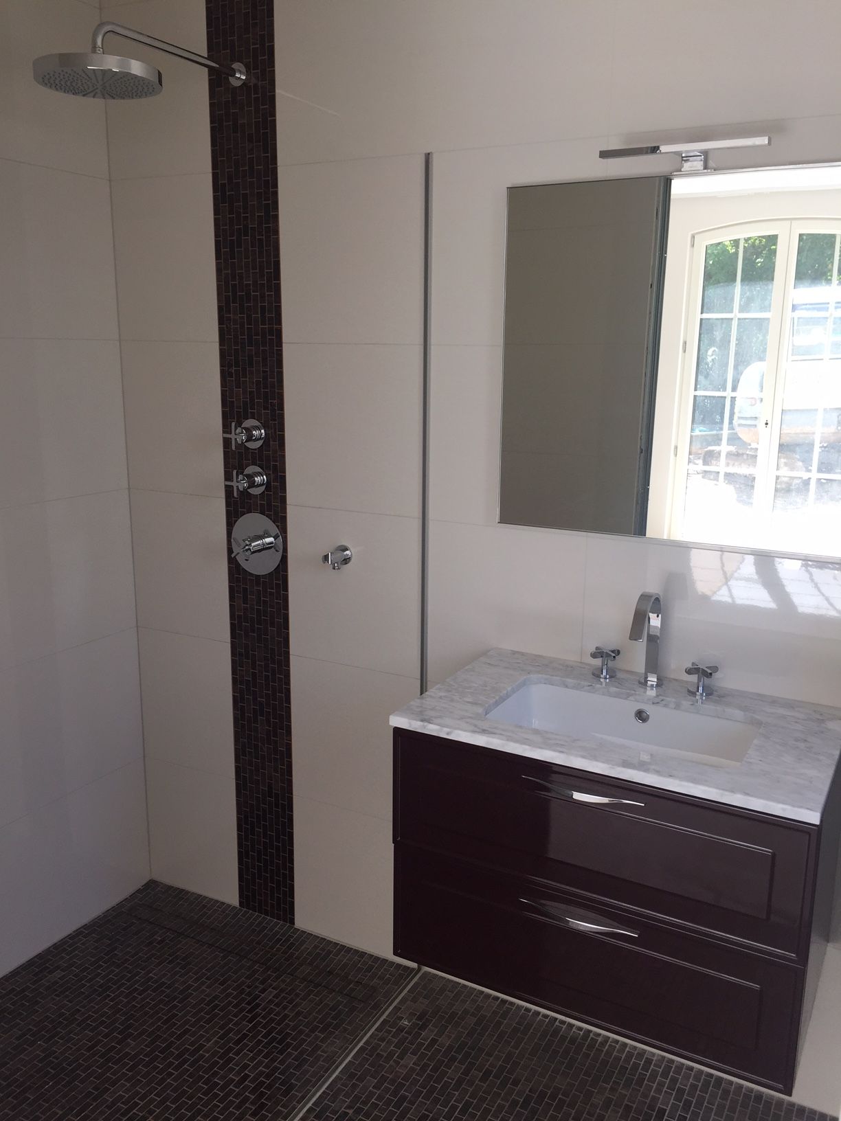 Baignoire JACOB DELAFON, type Presqu'île, équipé d'une robinetterie 3 trous. Douche à l'italienne en pierre de lave. Vasques VB LOOP collées par le dessous sur plan de travail en marbre.